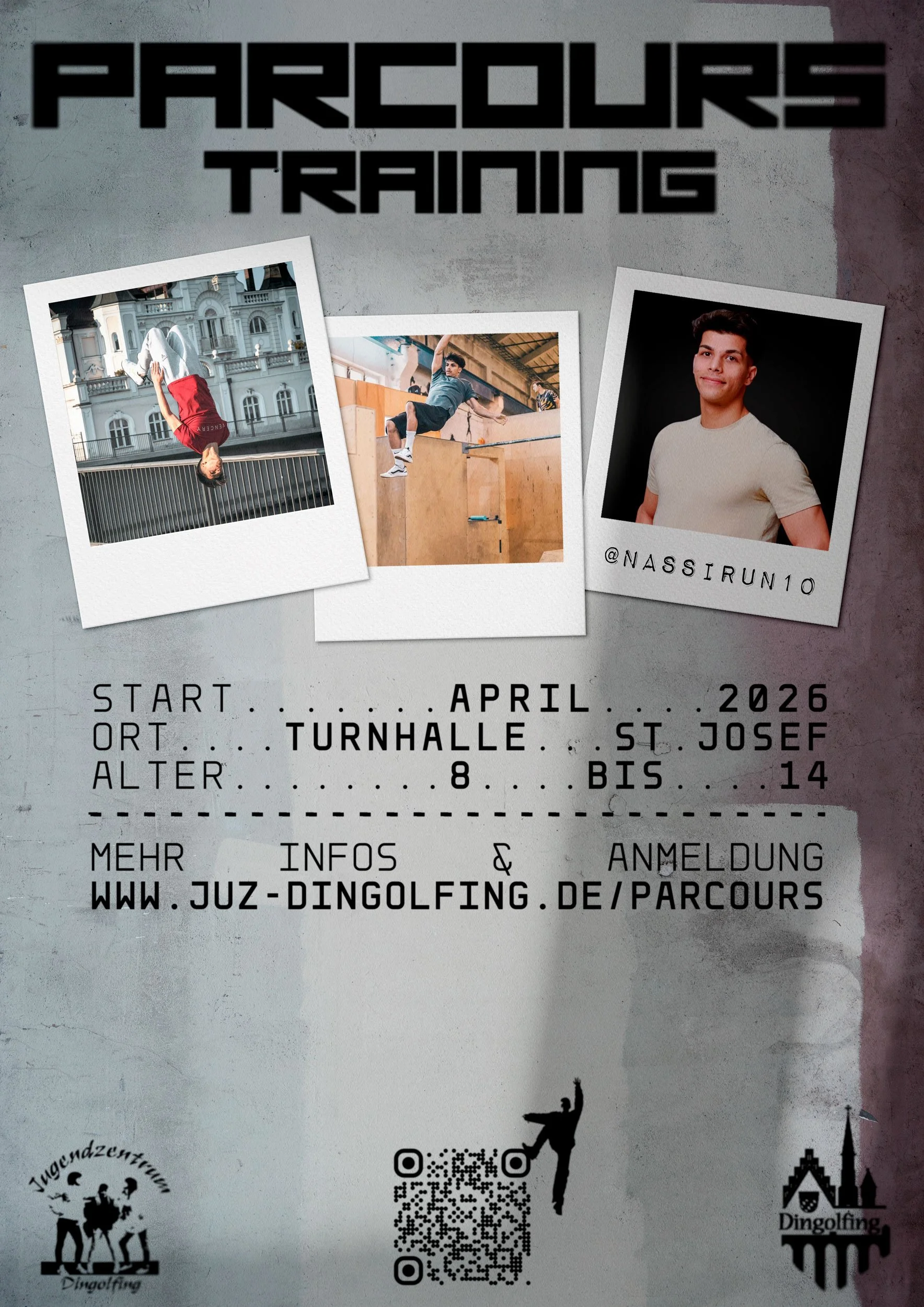 Das Jugendzentrum Dingolfing freut sich, zusammen mit Nasser Asefi (@nassirun10), ab April 2026 wieder ein Parcours-Training für Kinder anbieten zu können. Nach Rückmeldung der Teilnehmer:innen wird die Kursdauer in diesem Halbjahr von 2 auf 3 Stunden verlängert.
